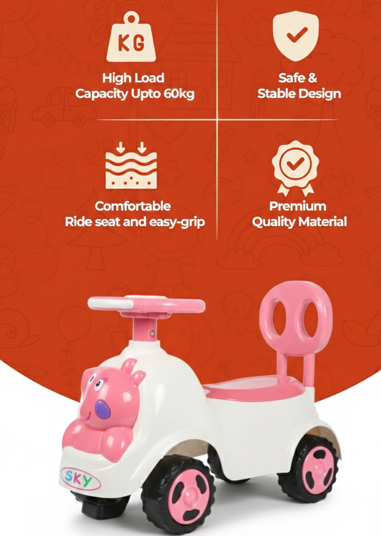 Make playtime more exciting with this adorable ride on toy, designed to give kids a fun, safe, and comfortable riding experience. Built with a strong structure and wide stable wheels, it ensures balance and confidence for toddlers while riding indoors or outdoors.